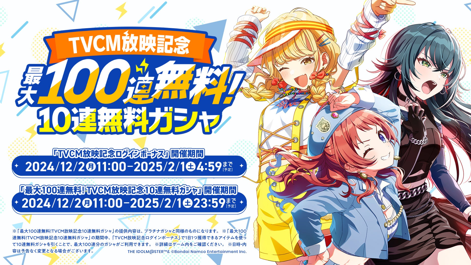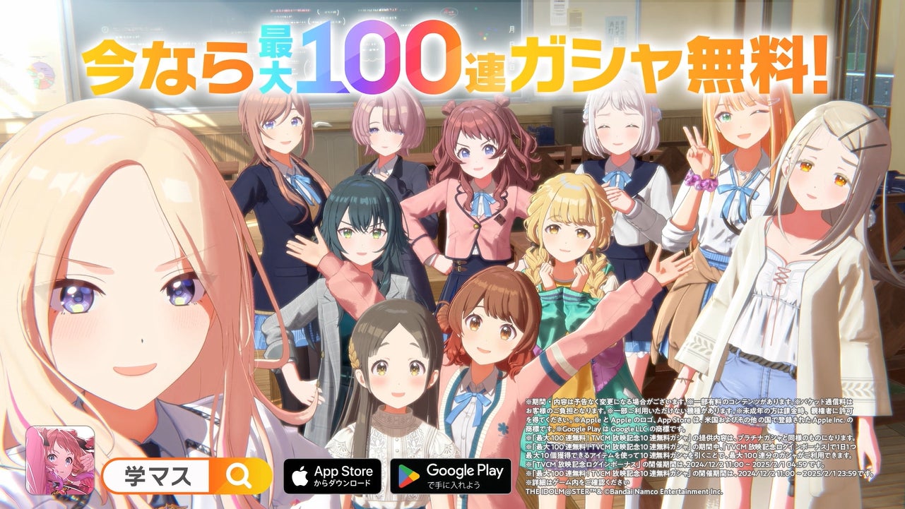 株式会社バンダイナムコエンターテインメントは、2024年12月2日(月)より、「学園アイドルマスター」の新TVCMの放映開始と、期間中いつログインしても最大100連ガシャが無料で引ける「最大100連無料!TVCM放映記念10連無料ガシャ」を開始したことをお知らせいたします。