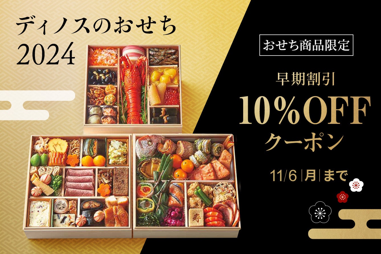 昨年配布した「おせち早期割引クーポン」がご好評をいただき、今年もいち早くおせちの特集サイト「ディノスのおせち2024」をプレオープンしました。こちらでは早期割引10%OFFクーポンを配布しております。