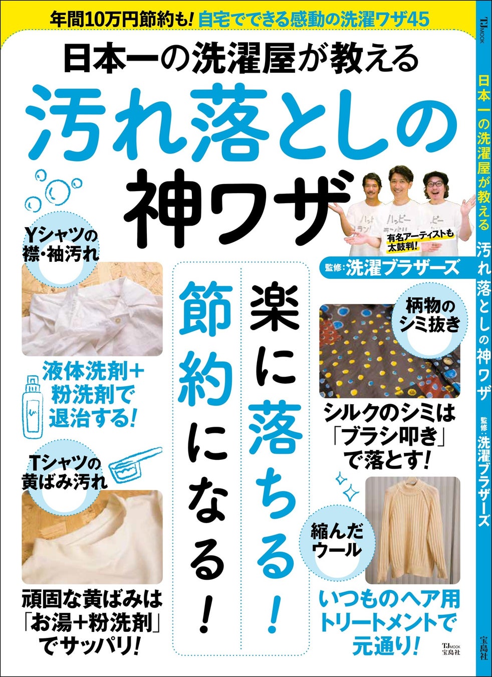 新世代の洗濯屋・洗濯ブラザーズ監修の最新ムック『日本一の洗濯屋が教える 汚れ落としの神ワザ』を7月22日(金)に発売します。高度な技術を要する舞台衣装のクリーニングなどで頭角を現した洗濯ブラザーズが、ほとんどの衣服をおうちでさっぱりと洗える感動の洗濯ワザをわかりやすく解説します! クリーニングに出すより1540円お得な柄ものシャツのシミ抜き方法、 825円お得なパンツのお手入れ方法など、家計にも衣服にもやさしい洗濯術を紹介。これまであきらめがちだった全体的な黄ばみや、柄ものについたシミも、衣服を傷めずしっかり落とせるテクニックには、目からウロコの連続です。あわせて、クリーニング店に依頼するときのコツや、プロ目線での洗濯機の選び方など、ユニークな記事も満載。家計が助かり服が喜ぶ感動の洗濯ワザで、あなたのワードローブを大復活させましょう!