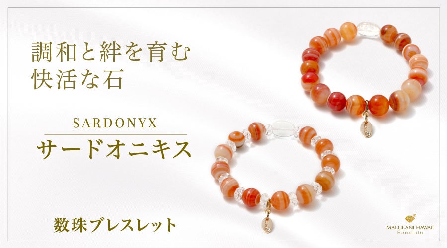 ハワイ発祥の天然石アクセサリーブランド「マルラニハワイ」では、安らぎと前向きなエネルギーをもたらすパワーストーン「サードオニキス」を使用した、数珠ブレスレットを発売いたします。