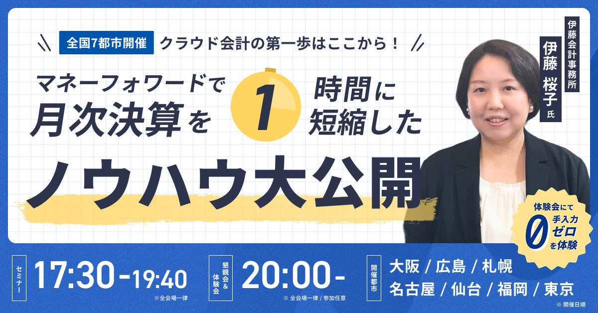 タイトル:【全国7都市開催】クラウド会計の第一歩はここから!マネーフォワードで月次決算を”1時間”に短縮したノウハウ大公開
