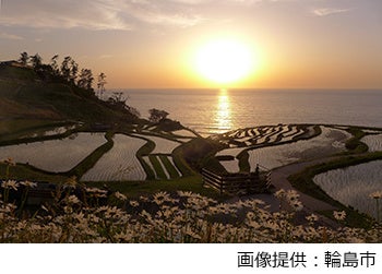 奥能登の日本海に面して1,004枚並ぶ棚田。山の斜面に小さな田んぼが重なり、海岸まで続く絶景を見ることができます。春~夏の田植えシーズンを迎えるころ、雨上がりに水を一面に蓄えた田が日本海に沈む夕日を受けてきらめき、無数の水鏡のように光を映しだす景色は圧巻。