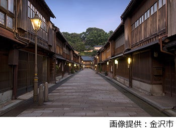 名物の金箔ソフトなどのスイーツや伝統工芸品を扱うショップが並ぶ人気の観光スポット。和の趣あふれる茶屋街は、雨の日でもフォトジェニック。雨に濡れた石畳に反射する街灯や出格子の雰囲気もあいまって、より一層風情豊かな光景が広がります。
