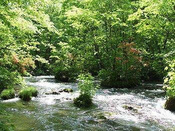 丘陵地にブナが生い茂り、木の立ち姿が美しいことから「美人林」と呼ばれる樹齢約100年のブナ林。ブナの葉の緑と幹が雨に濡れると、より美しく輝きます。また、野鳥の生息地でもあり、透き通るような鳥の鳴き声が響く美人林の中には池があり、水面に映る木々も魅力。