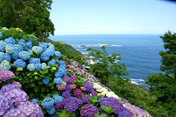 日向灘を一望!宮崎県・遠見半島の青い海を眼下に、岬の斜面に200万本の紫陽花が咲き広がり、紫陽花と青空・海のコントラストが美しいスポット。東京ドーム約4つ分の広さを持ち、7色にも色を変えるといわれる紫陽花が楽しめる自然園は、まさに桃源郷という名にふさわしい美しさ。