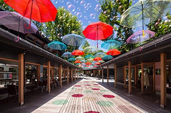 ハルニレテラスの街並みが100本を超えるカラフルな傘で彩られる「軽井沢アンブレラスカイ」。「傘のアーケード」が頭上を明るく彩り、今年は雨上がりの虹をイメージしたシャボン玉が現れる演出も。夕暮れには傘がライトアップされ、夜空に架かる虹のような幻想的な光景が楽しめます。