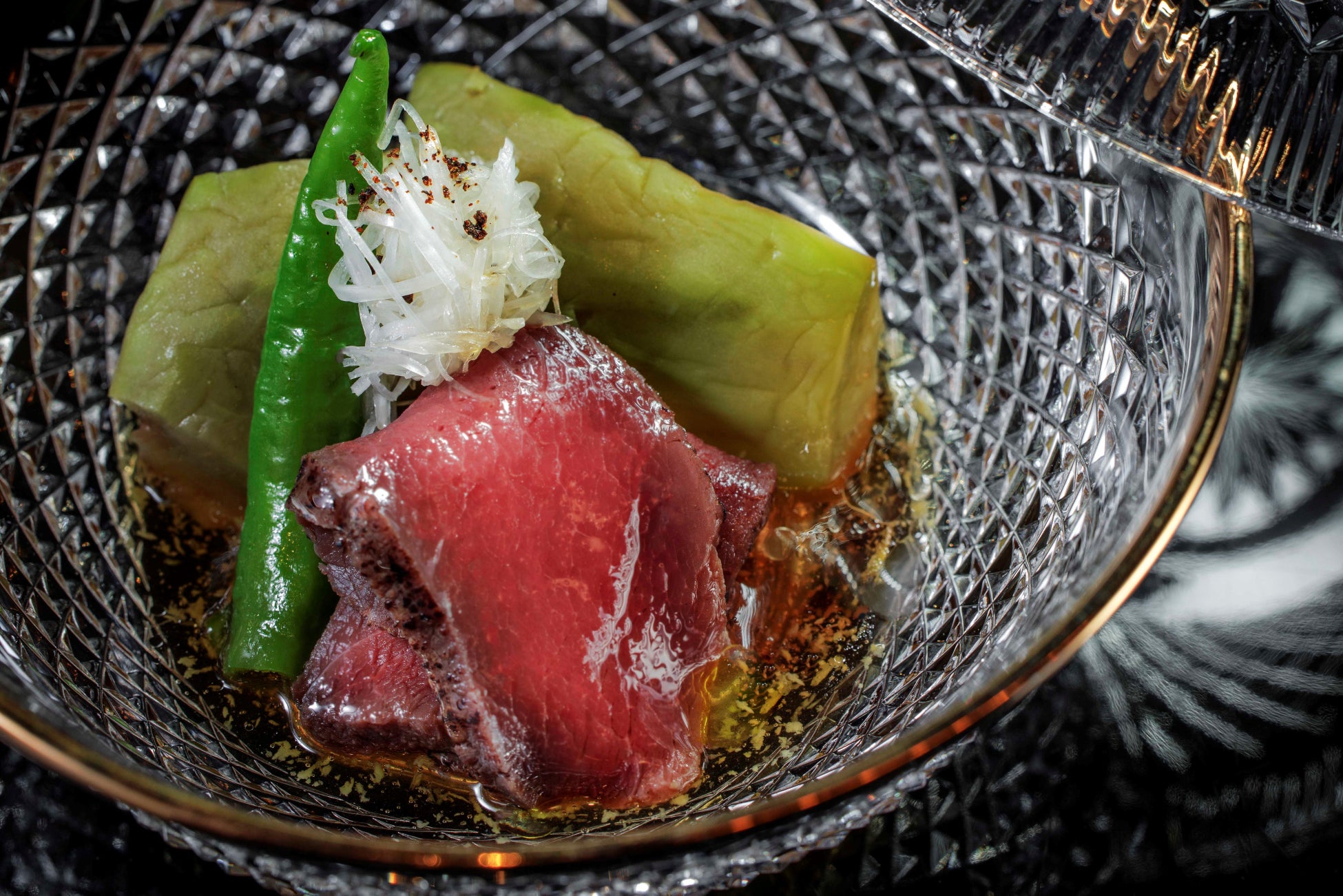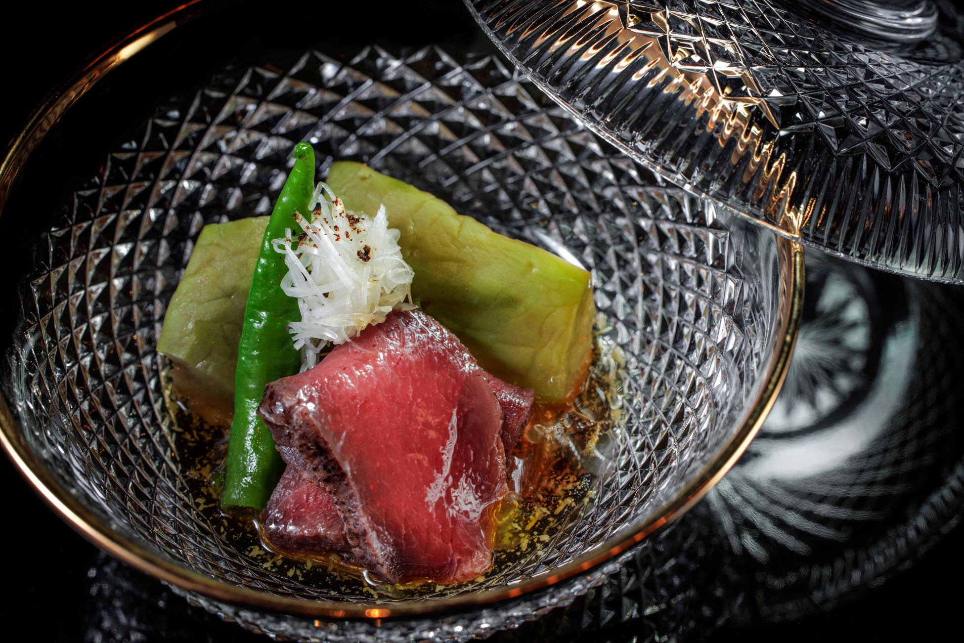 夏鹿のローストと、信州の伝統野菜にも認定されている丸茄子を組み合わせた、涼やかな冷鉢です。脂ののった夏鹿のしっとりとした旨みと、甘長唐辛子のほろ苦さ、ネギの繊細な口当たりが、味わいに奥行きを生み出します。鹿出汁の冷製餡をまとわせることで、暑さに疲れた身体にもすっと馴染む、滋味深い仕立てに。軽井沢の涼やかな気候と、山の恵みが凝縮された、信州の夏を映した一皿です。