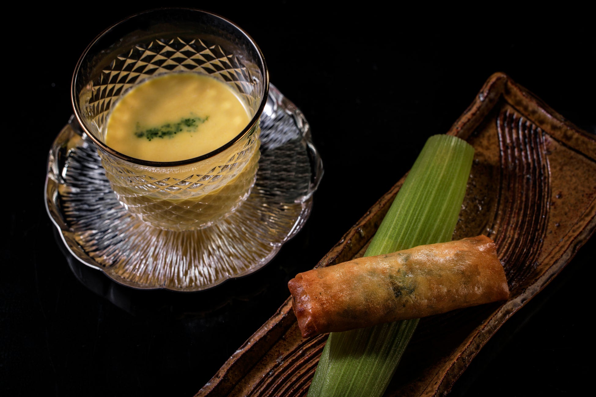 トウモロコシの自然な甘みを生かした、夏ならではの進肴です。滑らかな口当たりに仕立てたすり流しに、香ばしく揚げた春巻きを添え、異なる食感と香りを閉じ込めました。そのままはもちろん、春巻きをすり流しにくぐらせて味わうことで、トウモロコシのさまざまな味わいを堪能できます。揚げ物の香ばしさとすり流しの軽やかさの調和を大切にした、暑さの中でもやさしく食欲を引き出す一品です。