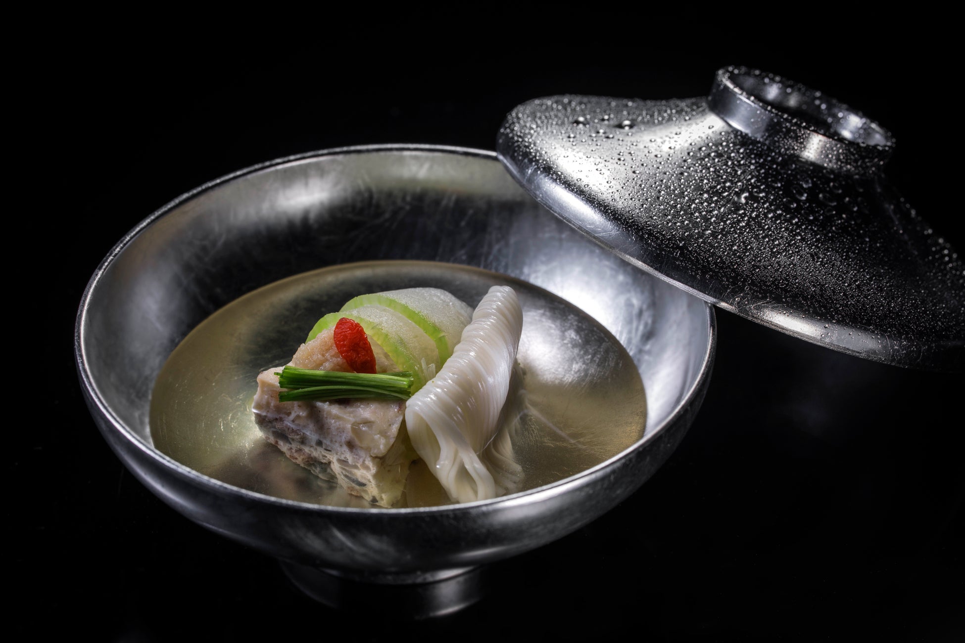 滋養豊かなすっぽんを真薯に仕立てた、夏の身体にやさしく沁みわたる一椀です。日本酒でじっくりと炊き出したすっぽんの出汁に昆布の旨みを重ね、琥珀色に澄んだ香り高いお椀に仕上げました。生姜の香り、素麺の喉ごし、冬瓜の涼やかな食感が、夏の疲れをそっと癒します。「食べる養生」をテーマにした、暑気払いにふさわしい一品です。