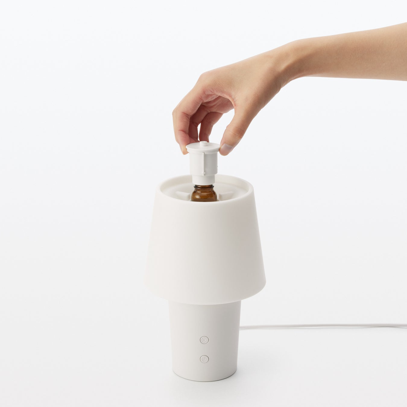 このたび発売する「水を使わないアロマディフューザー」は、花や樹木、果実などから抽出した無印良品のエッセンシャルオイル(10ml/別売り)にノズルキャップを取り付けてディフューザー内に直接セットするだけで、水を使うことなく、エッセンシャルオイル本来の香りを楽しめる直噴射式(ネブライザー式)です。芳香力が強く、オイルの頻繁な補充や水の管理などが必要ないのが特長です。動作は間欠駆動で、強弱モードが選べます。強モードは15秒間噴霧してから2分45秒間停止を繰り返し、弱モードは8秒間噴霧してから2分52秒間停止を繰り返します。エッセンシャルオイル1本(10ml)の使用目安は、使用環境や香りの種類によって消費量は異なりますが、1日2時間使用した場合、強モードで約25日間、弱モードで約50日間となります。