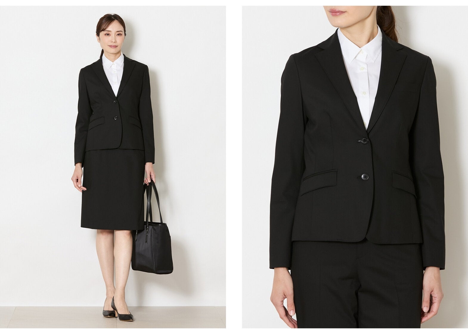 リクルートスーツの定番として、多くの場面で安心感のあるスカートスーツ。すっきりとしたシルエットは、清潔感と誠実さを演出します。膝の中心からやや隠れる着丈にするとバランスが良く、座った際にも露出を控えられます。迷ったときは、まず選びたい一着です。