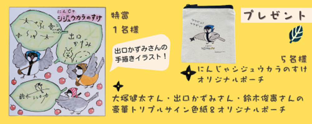応募期間中にぬりえに取り組んでいただき、ハッシュタグ「#シジュウカラのすけぬりえ」を付けてご投稿いただいた方の中から抽選で5名様に、「にんじゃ シジュウカラのすけ」オリジナルポーチをプレゼント!