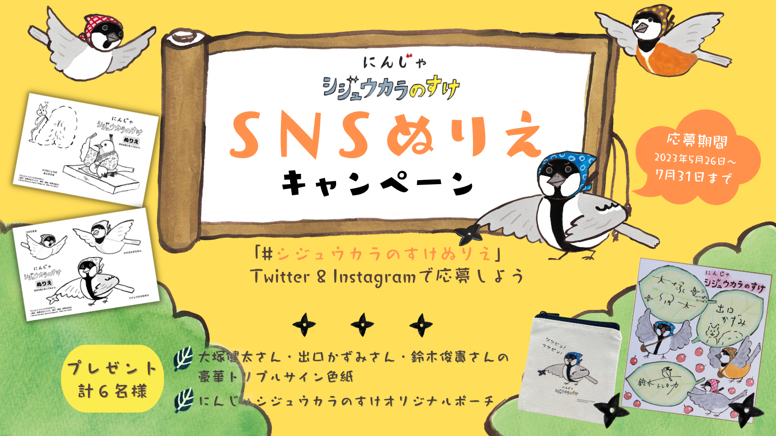 絵本『にんじゃ シジュウカラのすけ』の刊行を記念して、『にんじゃ シジュウカラのすけ』SNSぬりえキャンペーンを開催いたします。