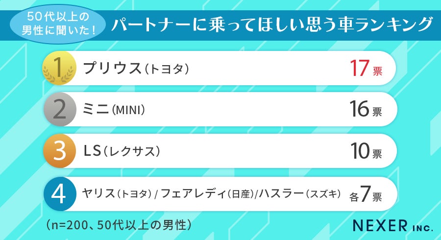 今回は、パートナーに乗ってほしい車に関するアンケートを取り、その結果をランキングにしました。