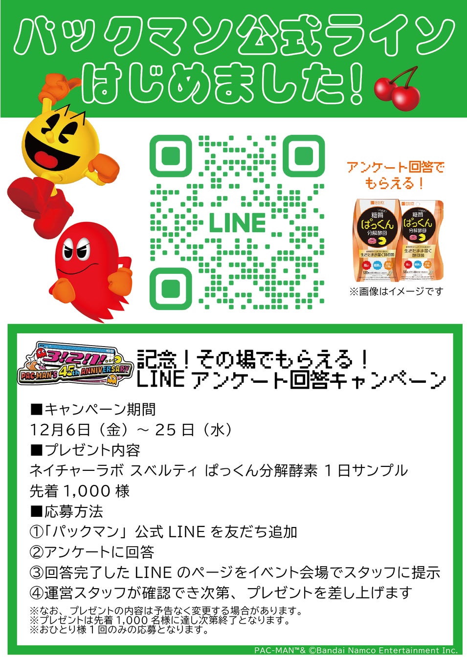 【3! 2! 1!...PAC-MAN'S 45th ANNIVERSARY!記念 その場でもらえる!LINEアンケート回答キャンペーン】