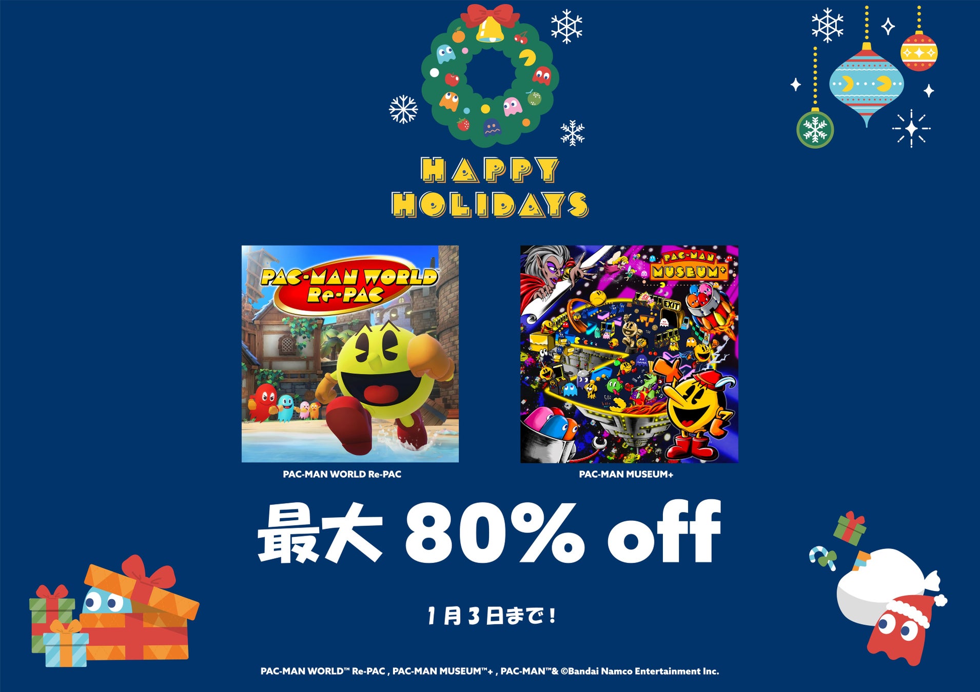 今年一年の感謝を込めて「パックマンワールド リ・パック」や「パックマン ミュージアム プラス」を含む『パックマン』の家庭用ゲームのダウンロード版を最大80%オフでお届けします。