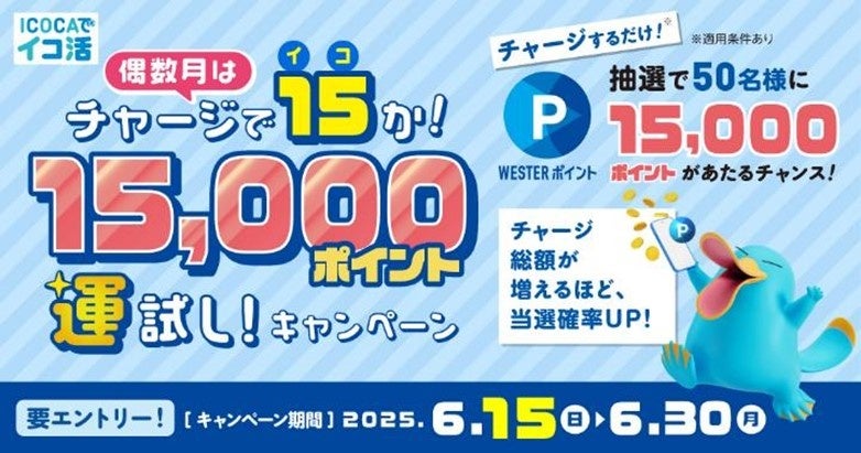 本キャンペーンでは、各対象期間中にお手持ちのICOCAで総額1,500円以上チャージされた方の中から、抽選で50名様にWESTERポイント15,000ポイントをプレゼントします。昨年度ご好評いただいた「チャージで運試し!」のキャンペーンが更にレベルアップ。今年度は偶数月(6月・8月・10月・12月・2月)の計5回の実施を予定しております。