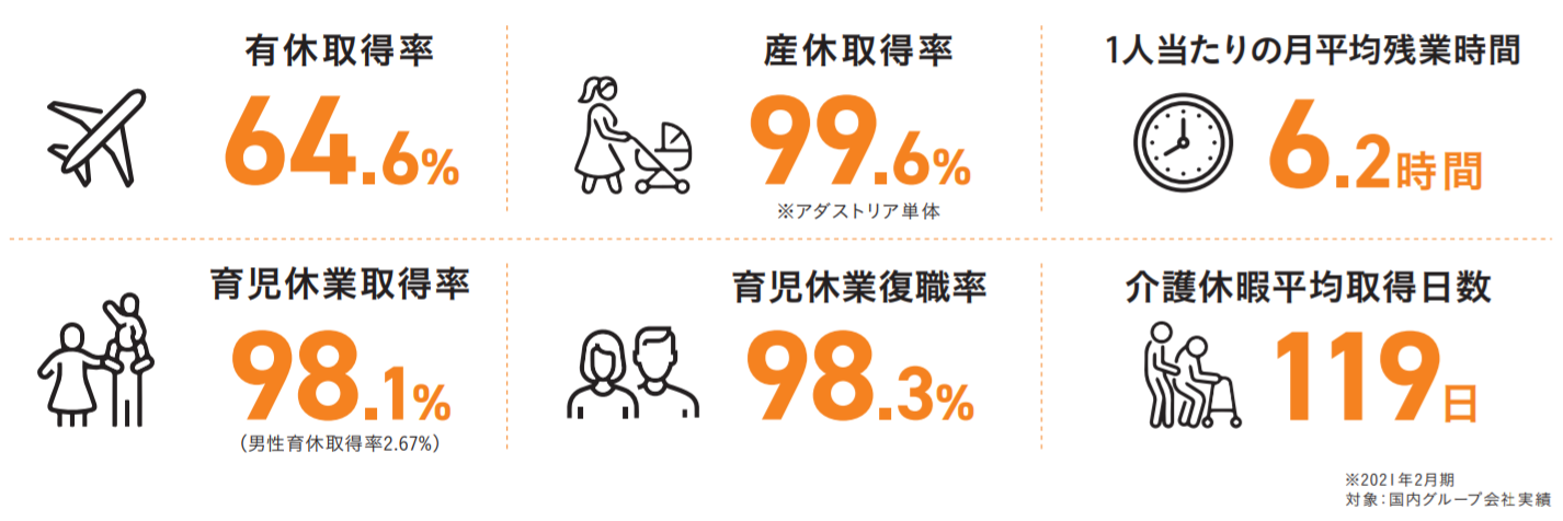 他企業と比べ、若い世代や女性の比率が高く、子育て中や多様な雇用形態で働く従業員が全国に存在していることから、当グループ従業員の特性にあわせた保健事業・福利厚生サービスを積極的に行うべく、2021年11月1日付でアダストリア健康保険組合を設立しました。婦人科検診の充実や、定期健康診断を受けられる対象医療機関の拡大といった保険者機能を強化するとともに、仕事を通じて自分自身の成長や充実感を感じられるよう、健康重視の風土醸成と安心・安全な職場環境を整え、従業員のウェルビーイング実現に向け取り組んでいく予定です。