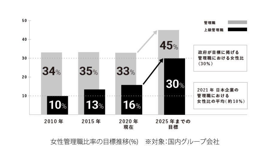現在も管理職における女性比率は内閣府の掲げる目標の30%を超える数値ですが、女性従業員が多い特性を活かし、「上級管理職の女性比率を2025年までに30%以上に引き上げる」という具体的目標を掲げ、多様性の推進を経営戦略のひとつに位置づけ、取り組みを行っています。