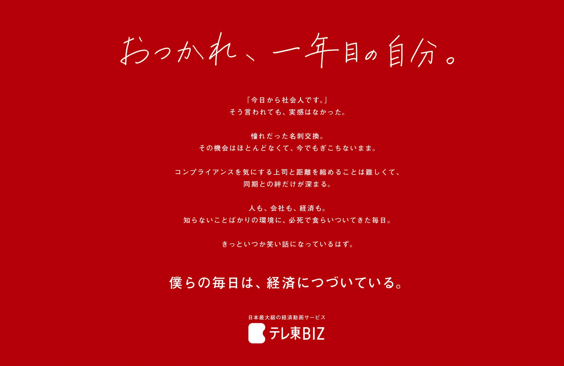 社会人一年目の毎日は、期待と不安の毎日です。同期に支えられたり、リモートワークに寂しさを感じたり、事への意欲で溢れていたり、仕事以外の悩みを抱えたり。そんな社会人一年目の本音に、日本一の経済動画サービスであるテレ東BIZが寄り添います。経済に初めて触れる人でも分かりやすいテレ東BIZだからこそ、本キャンペーンを通して社会人一年目を支える存在を目指します。