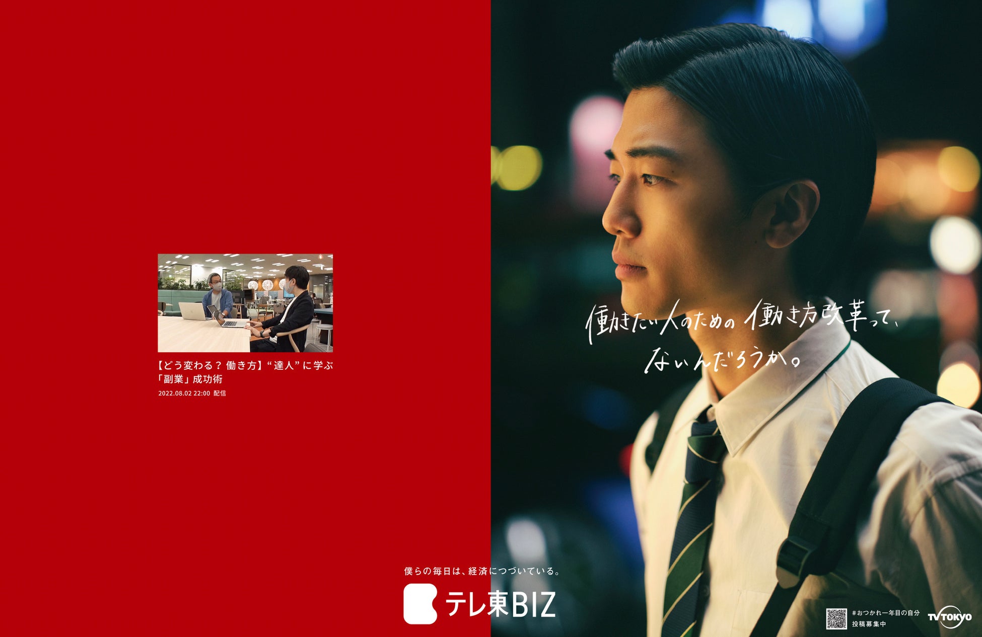 「僕らの毎日は、経済につづいている。」というタグラインに沿って、2022年4月1日以降にテレ東BIZで配信されたニュースと、その時々の社会人一年目の本音をつなぐ広告です。