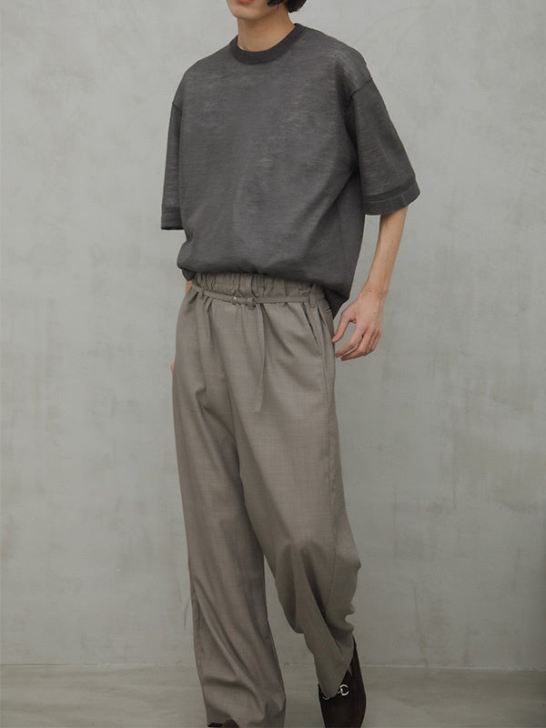 トレンド傾向のカーブシルエットが特徴のメリノウールを使用したトロピカル素材のイージーパンツ。取り外しができる共布の細いベルト付きで、スタイリングによって使い分けて着用ができるのもポイントです。