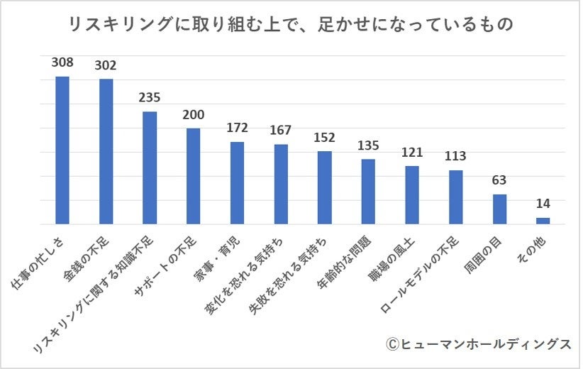 ● 「リスキリングに取り組む上で足かせになっていること」は、1位「仕事の忙しさ」 2位「金銭の不足」 3位「リスキリングに関する知識不足」
