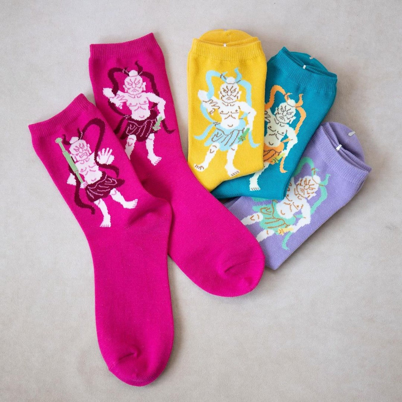 仏下金剛力士あうんソックスは左足に阿形、右足に吽形をデザインした金剛力士像柄の靴下です。お寺の門番である金剛力士はその筋肉質な肉体と立派な脚が物語るように健康、健脚の神様としても知られています。そんなあうんソックスの限定カラー「マゼンタ」が登場。他の定番カラーもお持ちします。