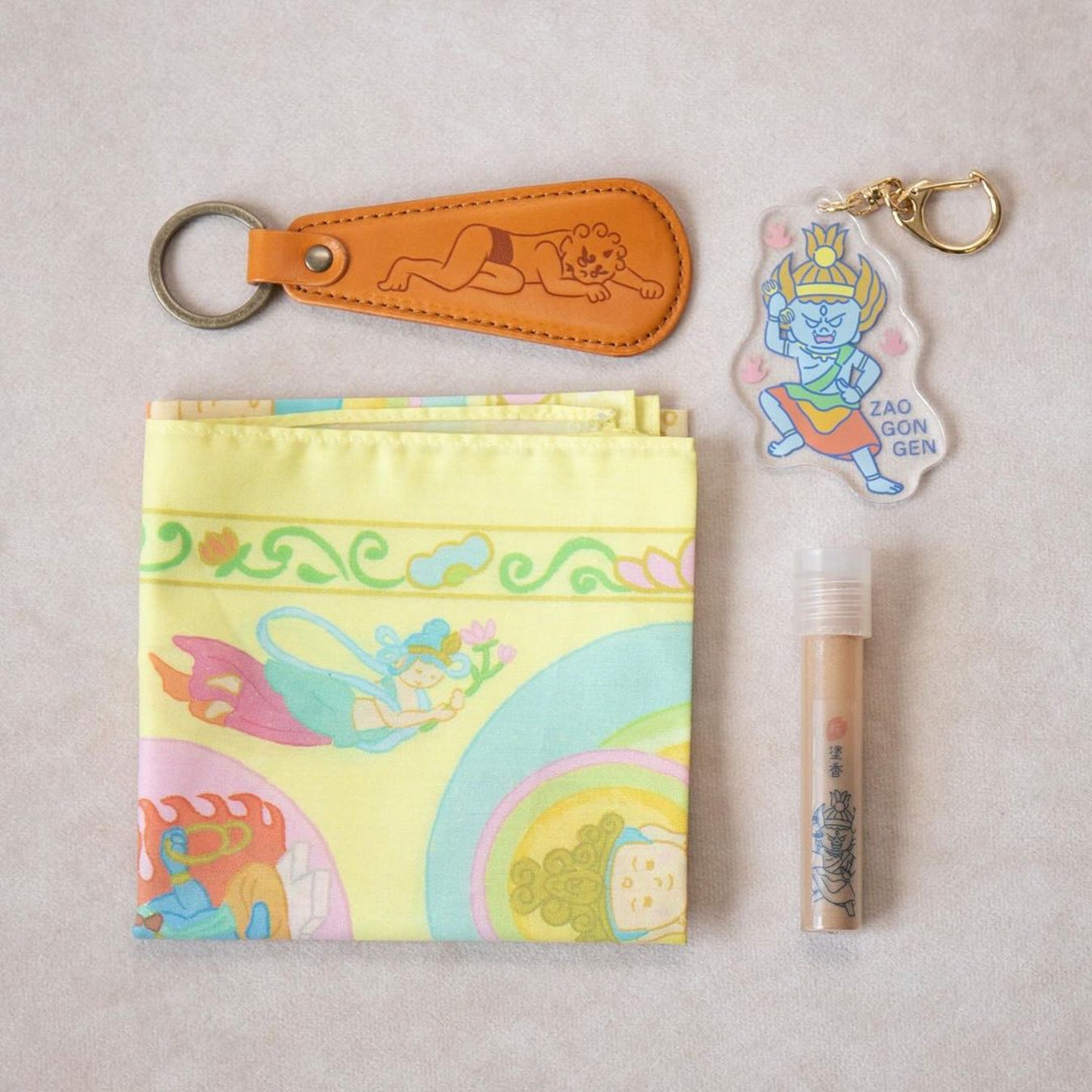 カラフルな曼荼羅のハンカチ、吉野山の桜をイメージした塗香、蔵王権現アクリルキーホルダー、邪鬼が刻印された靴ベラなど仏像をモチーフにしたグッズも盛りだくさん。