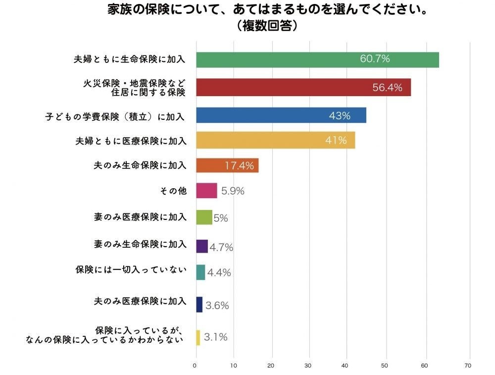 家族の保険について聞いてみると、6割以上の人が夫婦ともに生命保険に加入、4割以上の人が夫婦ともに医療保険に加入していることがわかりました。また持ち家率の高さと関係する住居に関する保険も加入率が高い結果に。さらに、子どもの学費保険に加入している世帯も4割を超え、子育て世帯ならではの保険選びをしていることもわかりました。