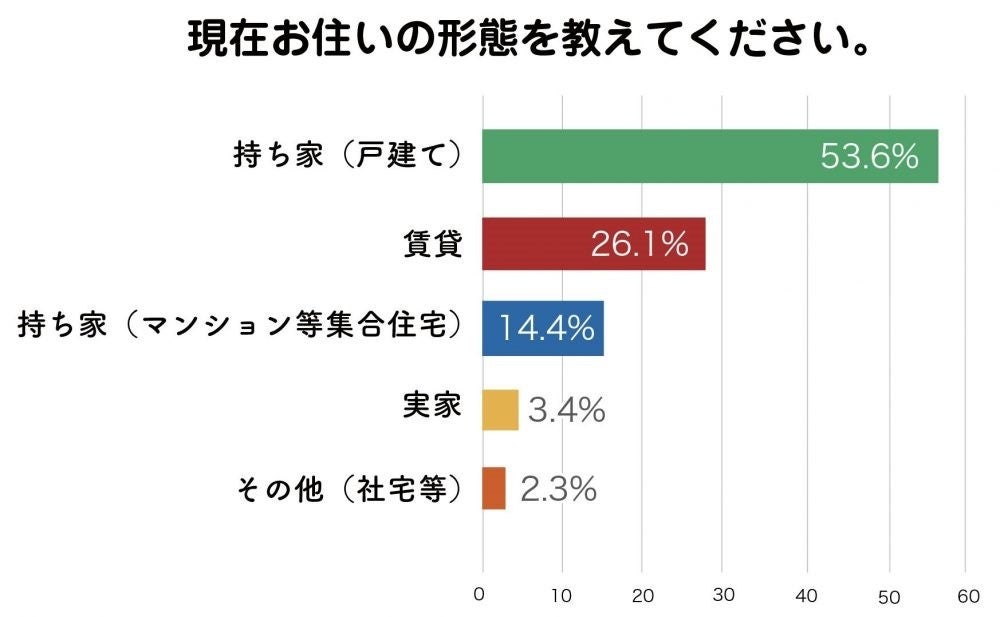 全体の50%が戸建ての持ち家に住み、13%がマンション等の集合住宅に住んでいることがわかります。戸建とマンションの持ち家率を合計すると、約63%が持ち家を購入済みという結果に。一方、25%の家庭は賃貸住宅で暮らし、実家や社宅等の回答は少数となりました。