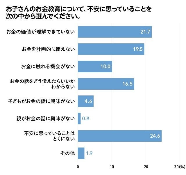 子どものお金教育について、818人中202人(全体の24.6%)から「不安に思っていることは特にない」との回答が集まったものの、178人(全体の21.7%)が「お金の価値が理解できていないこと」、160人(全体の19.5%)が「お金を計画的に使えないこと」に不安を感じていることがわかります。また、「子どもにお金のことをどう伝えたらいいのかわからない」との声も。