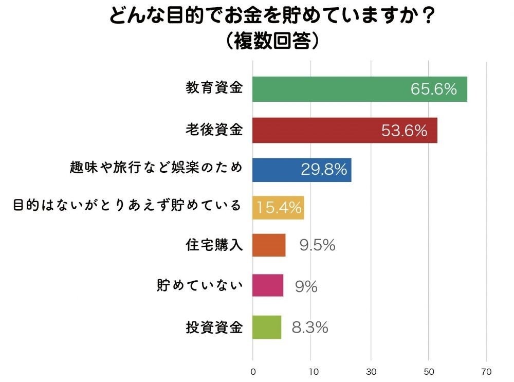 「どんな目的でお金を貯めていますか」という問いには、「教育費」という回答が62%でもっとも多く、次いで「老後資金」が53%で2位、「趣味や旅行のため」が27%で3位となりました。目的はないがとりあえず貯めているという人も13.8%いました。
