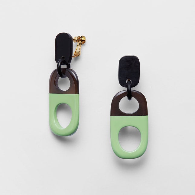 ナチュラルなブラウンカラーの水牛にライムグリーンの塗装を施した美しいイヤリング。存在感がありながら軽やかにつけられる耳元をスタイリッシュに飾ります。