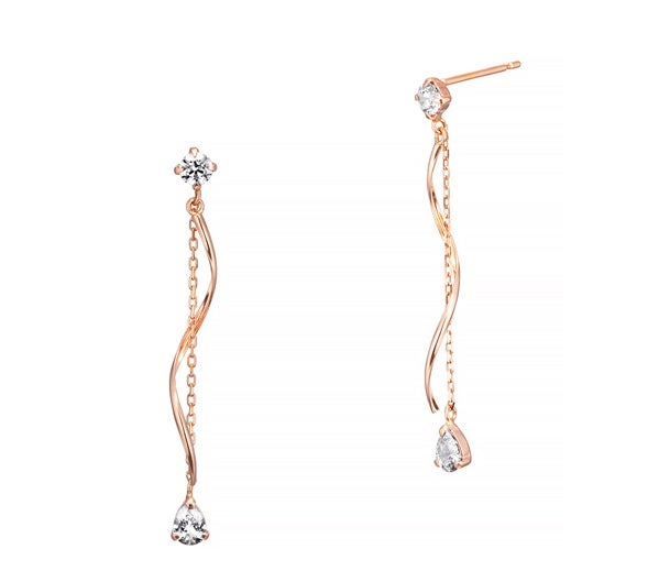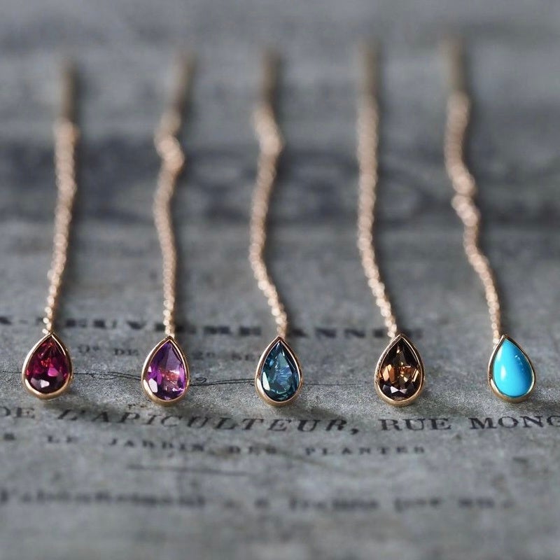 雫のようなシェイプのカラーストーンをごく軽やかにお仕立てしたロングチェーンピアス。一直線の光のラインが耳元に華やぎを添えてくれます。