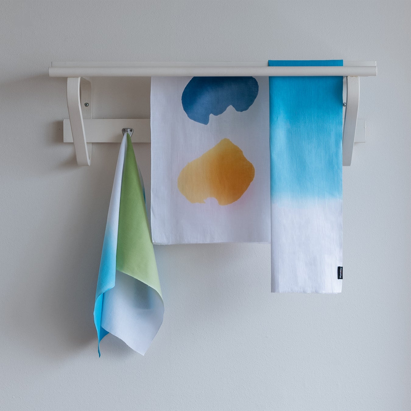 日本とフィンランドの自然、風景や四季、色やかたちから影響を受けたアーティスト・デザイナーの石本藤雄がデザインを手がけるライフスタイルブランドMustakivi(ムスタキビ)。33×90cmの布の中に込められた石本が描く世界は、アートファブリックそのもの。シーズンごとに発表される新柄は、生活の中に季節の色やかたち、空気を感じさせてくれます。拭く、敷く、巻く、包む以外に、壁にかけたり、ブックカバーにしたり、使い方は自由。端から出てきた糸は、丁寧にカットし、だんだんと長さが変わっていく表情の変化も楽しめます。
