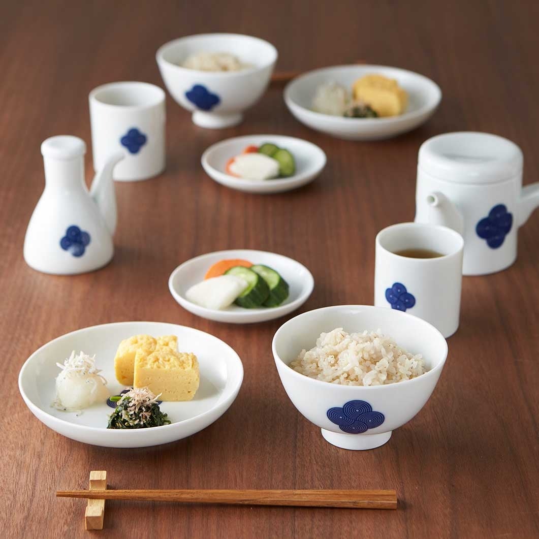 ・柳宗理「和食器」(呉須紋付):湯呑 2,200円(税込)/ 飯碗 2,200円(税込)/ 3.5寸豆皿 1,430円(税込)/ 5寸皿 1,870円(税込)/ 急須 5,280円(税込)/ しょう油差し(大)3,300円(税込)