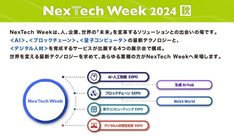 「AI・人工知能EXPO【秋】」は「NexTech Week 【秋】」の構成展として、ほか3つの専門展と同時開催! 最新テクノロジーに特化した専門展示会に、あらゆる技術・ソリューションが集まります。