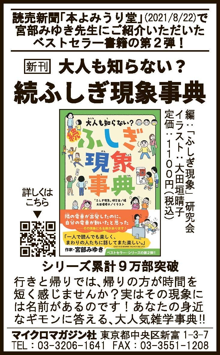 マイクロマガジン社(東京都中央区)は、『大人も知らない? 続ふしぎ現象事典』を10月14日の読売新聞に掲載いたしました。