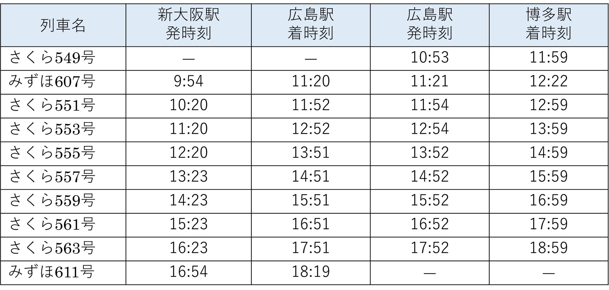 山陽新幹線 新大阪駅・広島駅・博多駅の上下線相互間