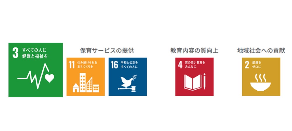 当社では2021年度より「子育てと豊かな社会づくりの星になる。」をスローガンに掲げ、子どもたち、子育てに関わる保護者、保育スタッフまで、子育てに関わるすべての人が「自分らしく生きられる」豊かな社会づくりを目指しています。こうした社会の実現は、いま世界全体で達成すべき目標として掲げられた「SDGs」の目標3「すべての人に健康と福祉を」の実現に貢献すると考えています。当社は目標3への貢献を軸に、「保育サービスの提供」「教育内容の質向上」「地域社会への貢献」の3つの側面からSDGsの達成に貢献し、社会と共にサステナブルな成長を目指します。