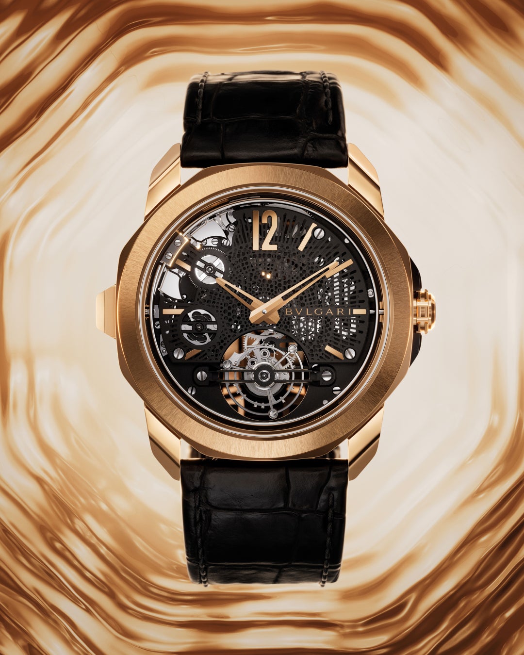 「オクト ローマ カリヨン トゥールビヨン」は、1時間、15分、1分単位で時間をチャイムで知らせ、改良されたキャリバーBVL428カリヨンが3つの音で15分を告げます。2016年にブルガリが発表した世界最薄のミニッツリピーターは、わずか3.12mmという記録的な薄さのムーブメントが2つの音を鳴らすものでした。そして2024年、ブルガリはこれら3つの卓越したムーブメントを採用することで、まるで腕元で室内楽のリサイタルが行われているかのようなタイムピースを作り上げたのです。