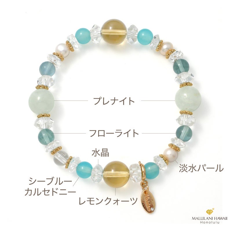 鮮やかなグリーンカラーのプレナイトやフローライトに、涼しげなシーブルーカルセドニーや水晶を組み合わせた、ライムと炭酸水を思わせる爽やかな色合いのブレスレットです。