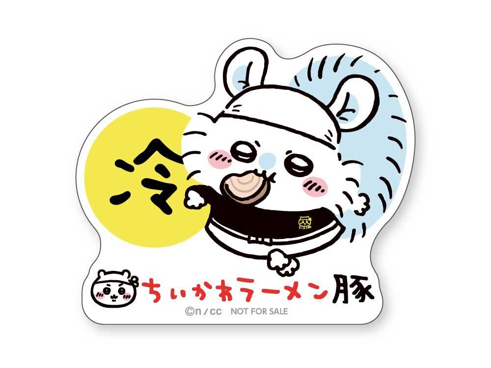 ラーメン豚はサイズをお選びください。ミニはちいかわ、小はハチワレ、大はうさぎがご提供。それぞれのキャラクターを模ったはんぺんを盛り付け。お好みをコールでお伝えください。またラーメンご注文特典としてノベルティステッカーをお渡しします。