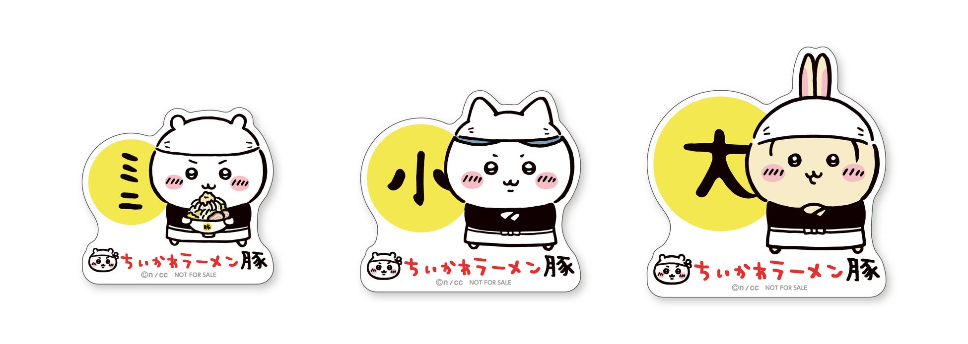ラーメンはサイズを「ミニ(ちいかわ)」、「小(ハチワレ)」、「大(うさぎ)」の3種から選べ、オリジナルどんぶりにてご提供いたします。ラーメンメニューをご注文された方には、特典としてオリジナルどんぶりデザインの特製ステッカーをそれぞれお渡しいたします。