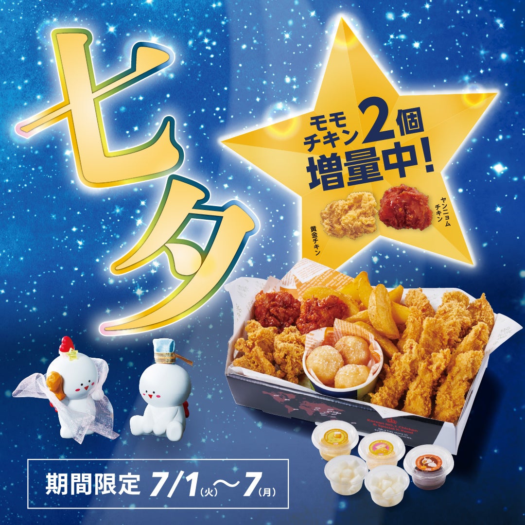 人気の「オリジナルボックス」に、骨なしモモ黄金フライドチキンと骨なしモモヤンニョムチキンを1個ずつ増量。単品積み上げ価格よりも750円おトクな、今だけの限定セットです。織姫と彦星も思わず笑顔になるような、豪華で楽しいチキンボックスを囲んで、七夕のひとときをお楽しみください。