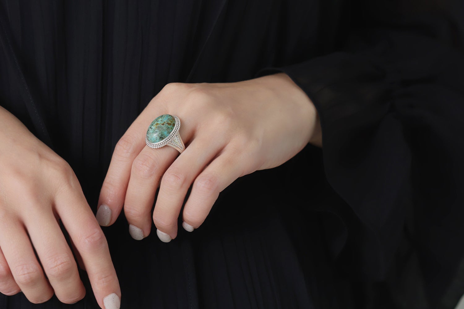 斑点模様が入った独特な印象のアフリカンターコイズをあしらった 新作 。