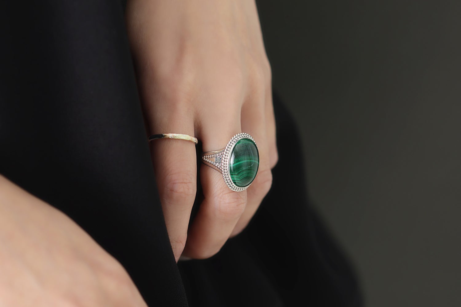 深みのあるグリーンと縦模様が独特な表情を醸し出すマラカイトをあしらった 新作 。