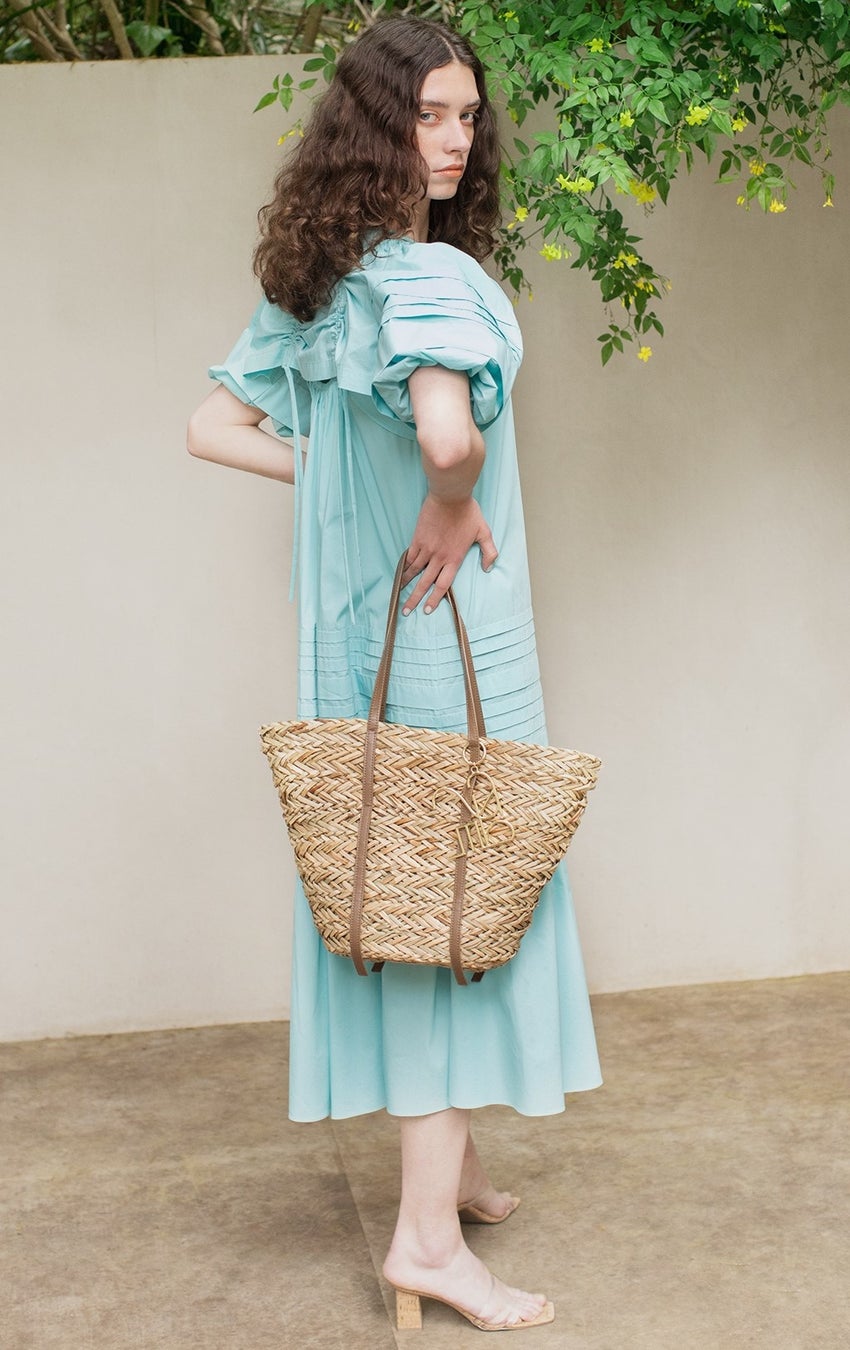 生地をたっぷりと使用し、腰から裾に向かって広がるフレアシルエットなので締め付け感がなく、リゾートスタイルにはもちろん、お食事のシーンにもおすすめの1着。ストラップ部分はキュッと結んだ愛らしいリボンデザインで、後ろ姿も美しく演出します。