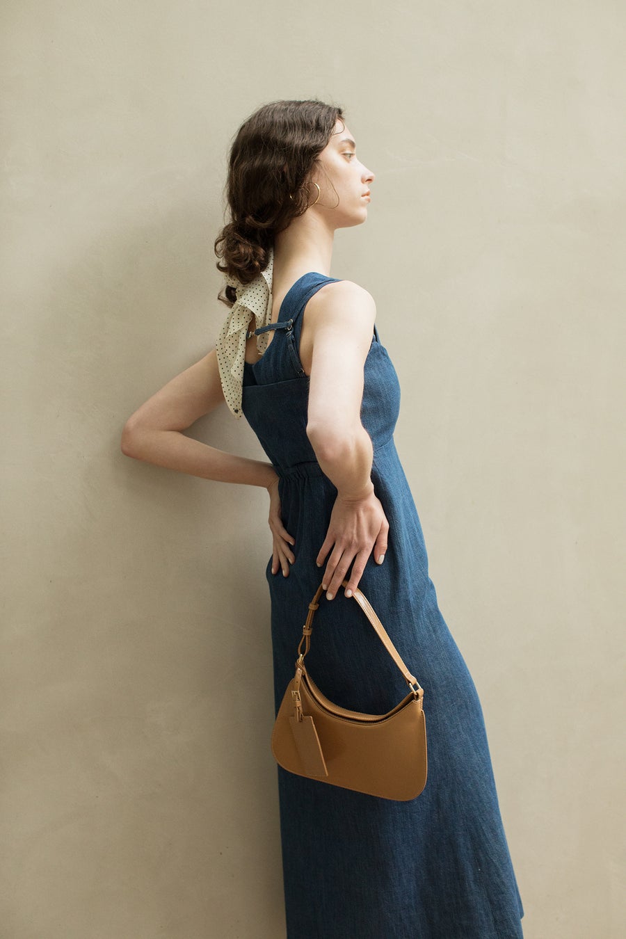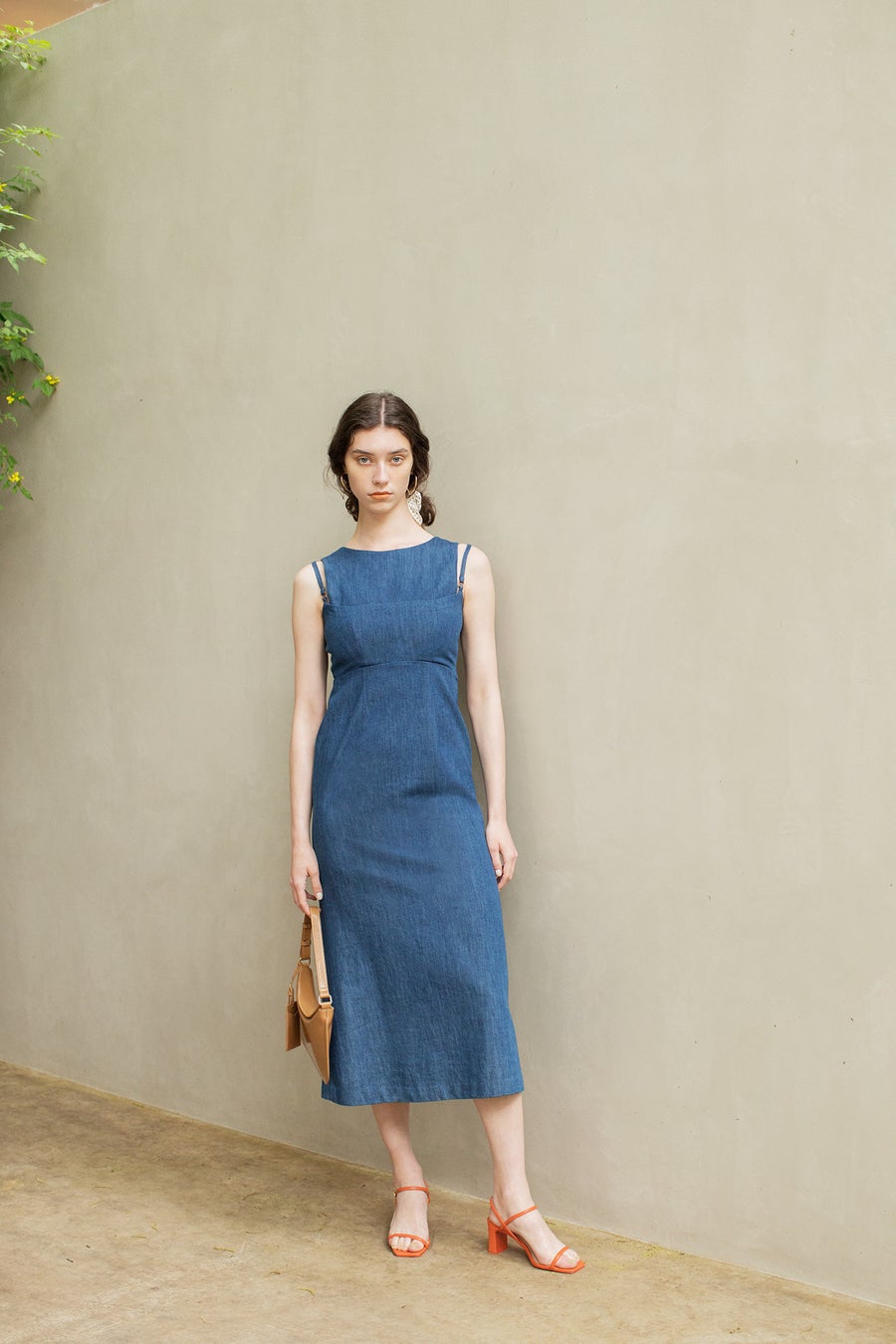 レイヤード風デザインがポイントの1枚でもお洒落度の高い着こなしを叶えるワンピース。ハイウエストの切り替えから、裾に向かってゆるやかに広がるマーメイドラインが品の良さを感じさせる秘訣。バックネックにはエレガントなビット金具つきのストラップをあしらい、後ろ姿まで印象的に。